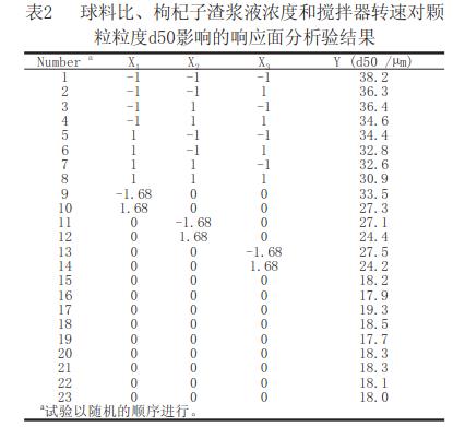 通過(guò)研究球料比、枸杞子渣漿液濃度、攪拌器轉(zhuǎn)速對(duì)枸杞子渣粒度的影響,得出如下結(jié)論: