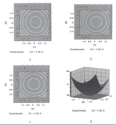 利用響應(yīng)面分析法[1]化枸杞子渣超微粉碎工藝參數(shù)。在單因素預(yù)試驗(yàn)基礎(chǔ)上,用SAS軟件系統(tǒng)進(jìn)行響應(yīng)面分析,設(shè)計(jì)一個(gè)三因素五水平的回歸方程來(lái)擬合因素和指標(biāo)(響應(yīng)值)之間的函數(shù)關(guān)系。選擇球料比(X1)、枸杞子渣漿液濃度(X2)和攪拌器轉(zhuǎn)速(X3)作為因素,以粉碎后的顆粒粒度d50作為響應(yīng)值對(duì)球磨機(jī)濕法超微粉碎工藝進(jìn)行化。